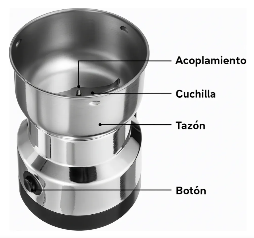 No utilice más de 2/3 de taza. Cuando utilice la cubierta superior de plástico, debe estar bien cerrada. Adecuado para: moler granos de café, cacahuetes, granos y almendras, etc. (estos sólidos no deben contener agua) en cualquier caso, la máquina puede funcionar de 30 a 45 segundos hasta que los sólidos se trituren satisfactoriamente.