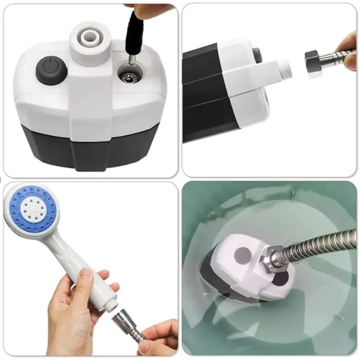 Esta ducha compacta y recargable convierte cualquier balde de agua en una ducha funcional, potente y lista para usar donde estés.